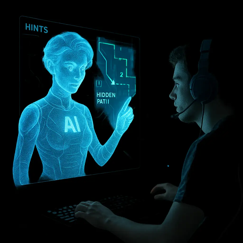 Геймер за комп’ютером із підказками штучного інтелекту на екрані, платформа Lobby9